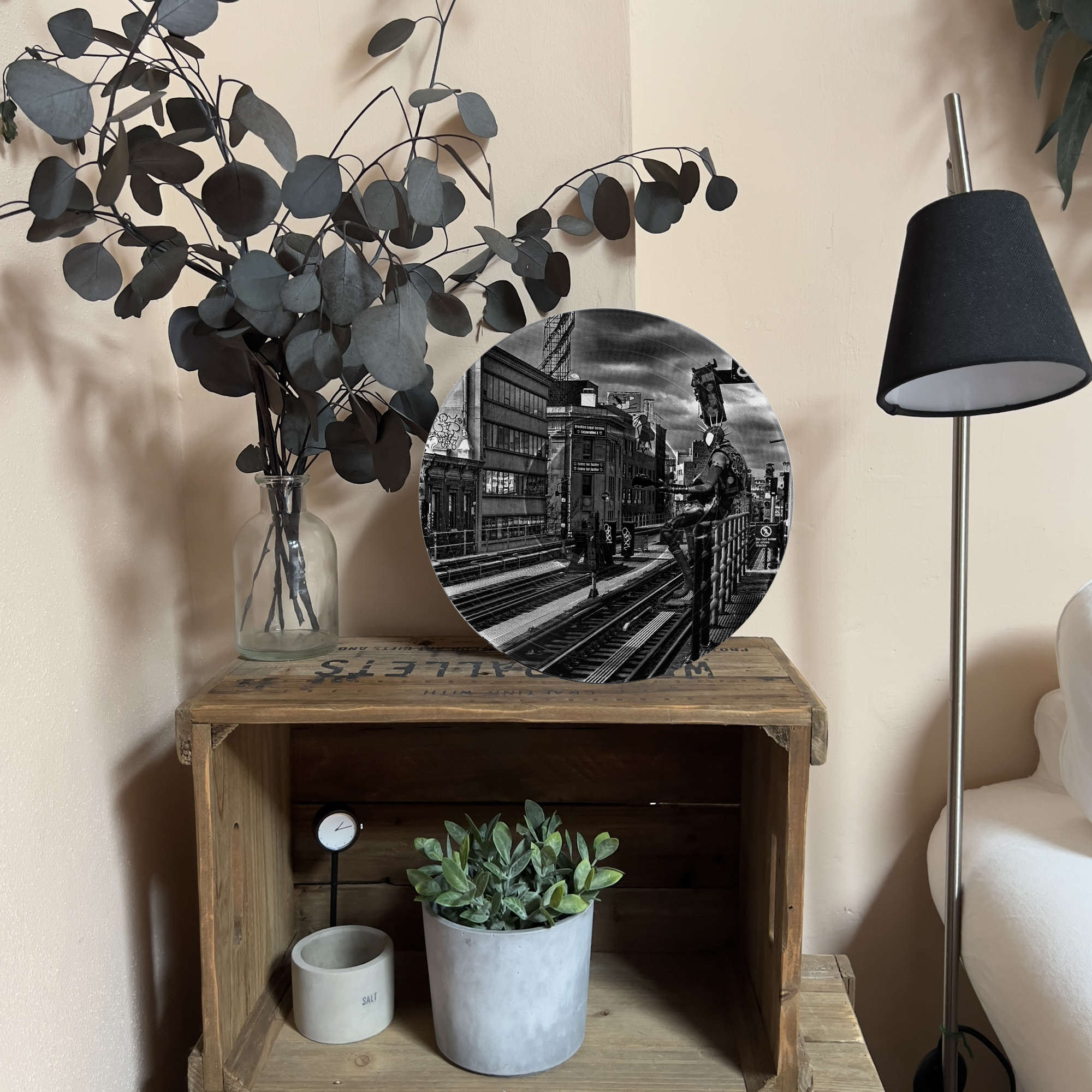• Vinyl record photo art featuring Spider-Punk at a Brooklyn train station, styled on a gallery wall.