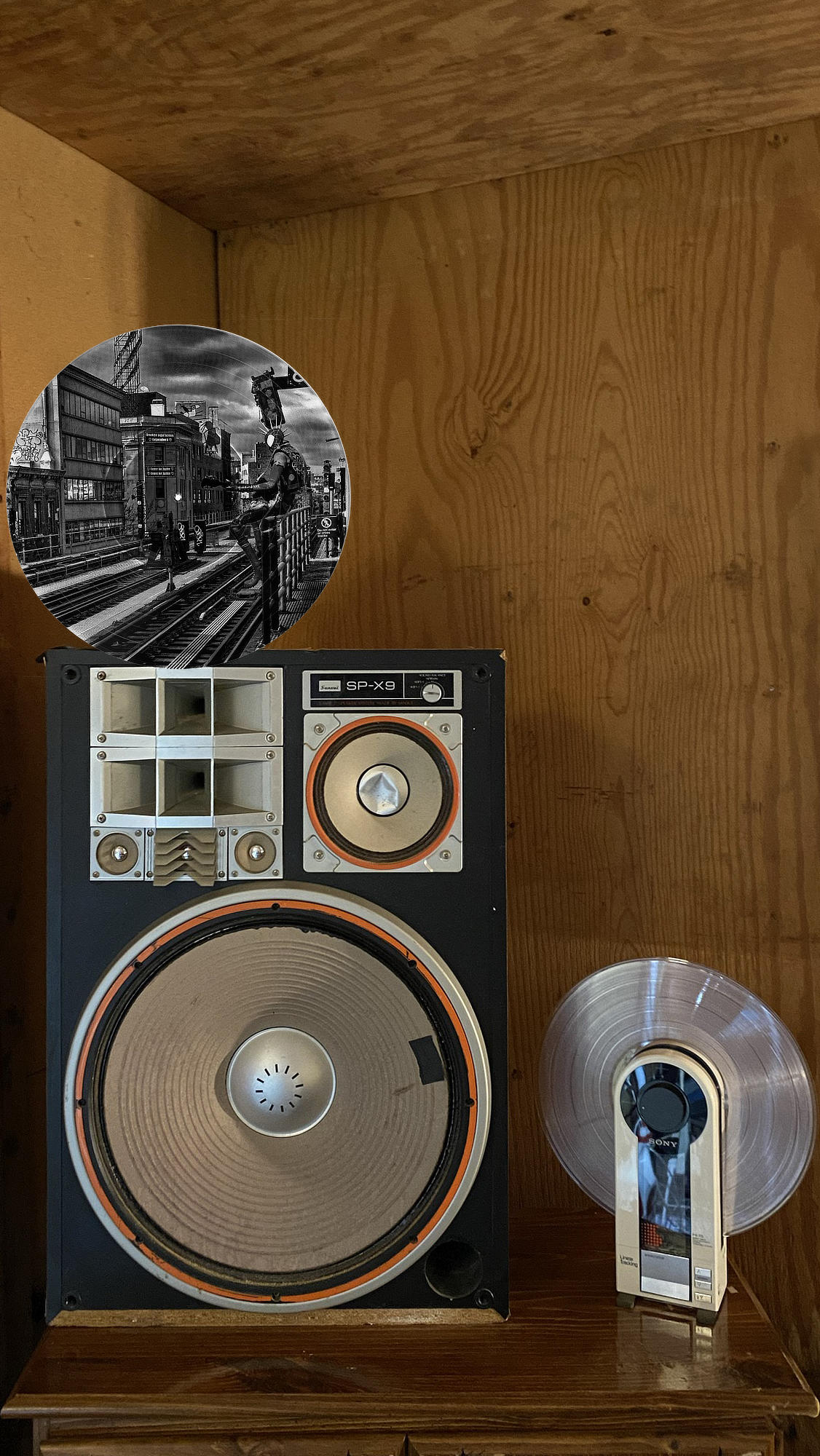 • Vinyl record photo art of Spider-Punk playing guitar at a Brooklyn train station, displayed at an art market booth.