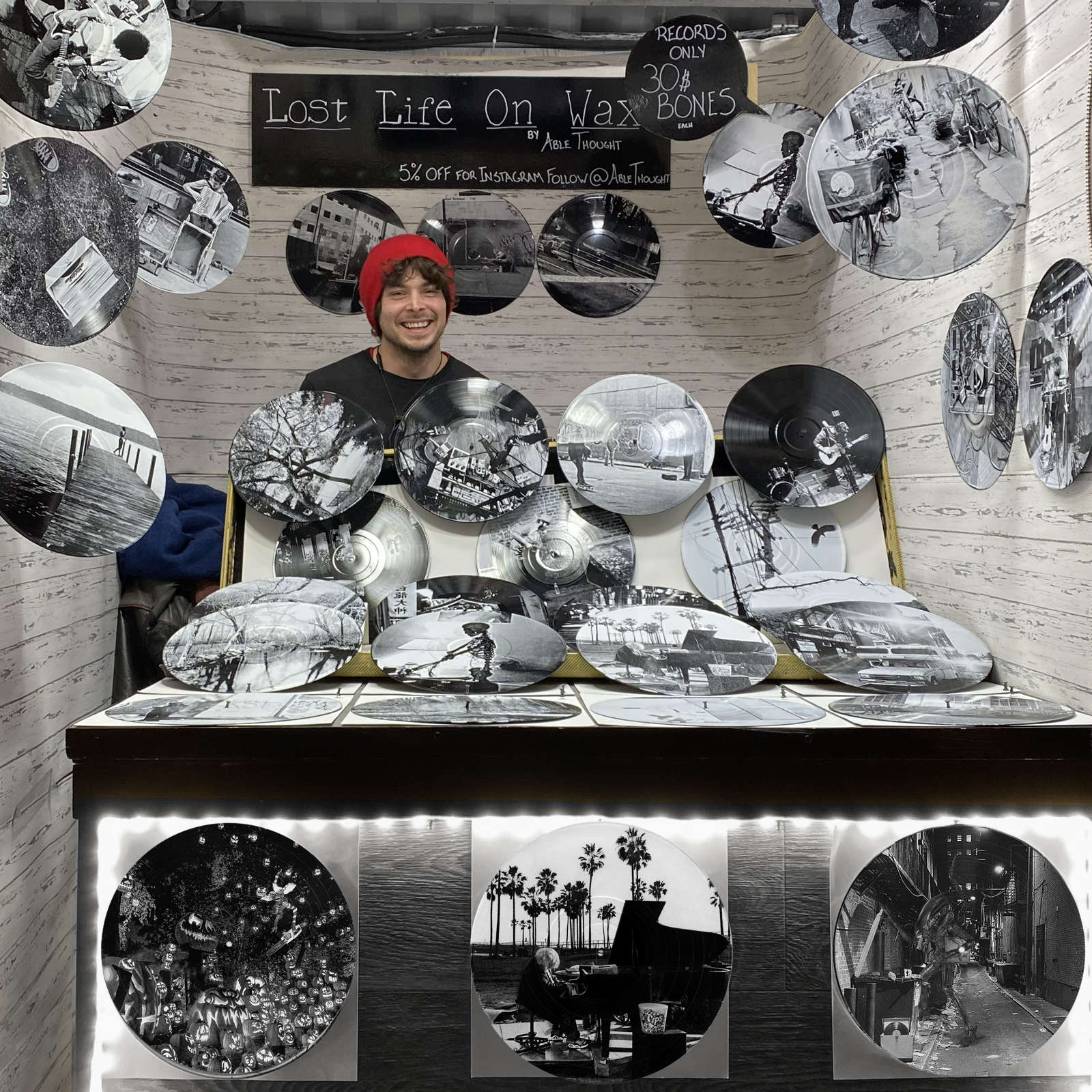 • Vinyl record photo art of a pianist playing on Venice Beach, displayed at an art market booth.