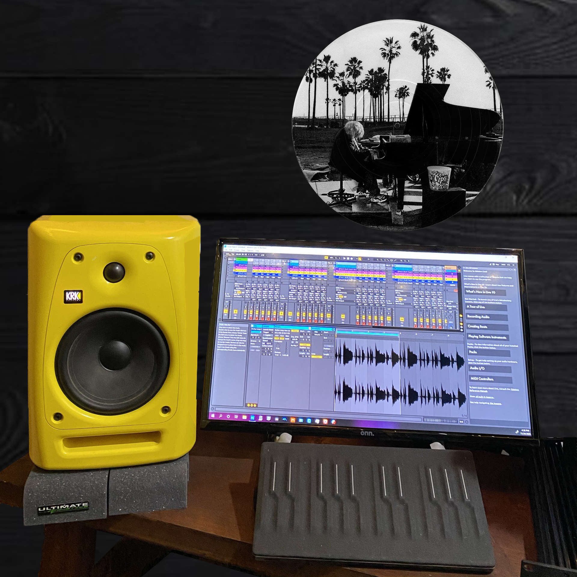 • Black and white vinyl record photo art of a piano player at Venice Beach sunset, featured in a recording studio setting.